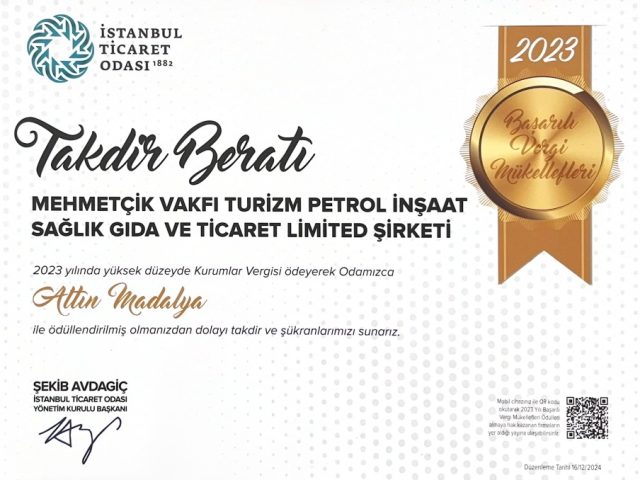 Şirketimiz 2023 yılında yüksek düzeyde ödemiş olduğu Kurumlar Vergisi nedeniyle İstanbul Ticaret Odası (İTO) tarafından ”ALTIN MADALYA” verilmiştir.